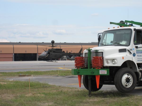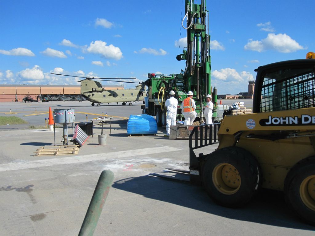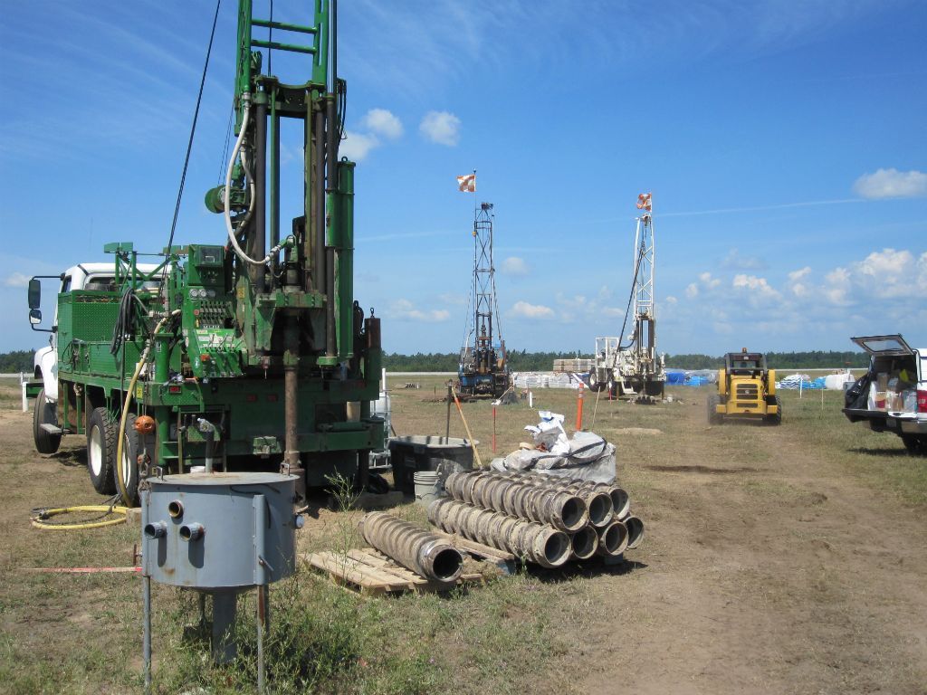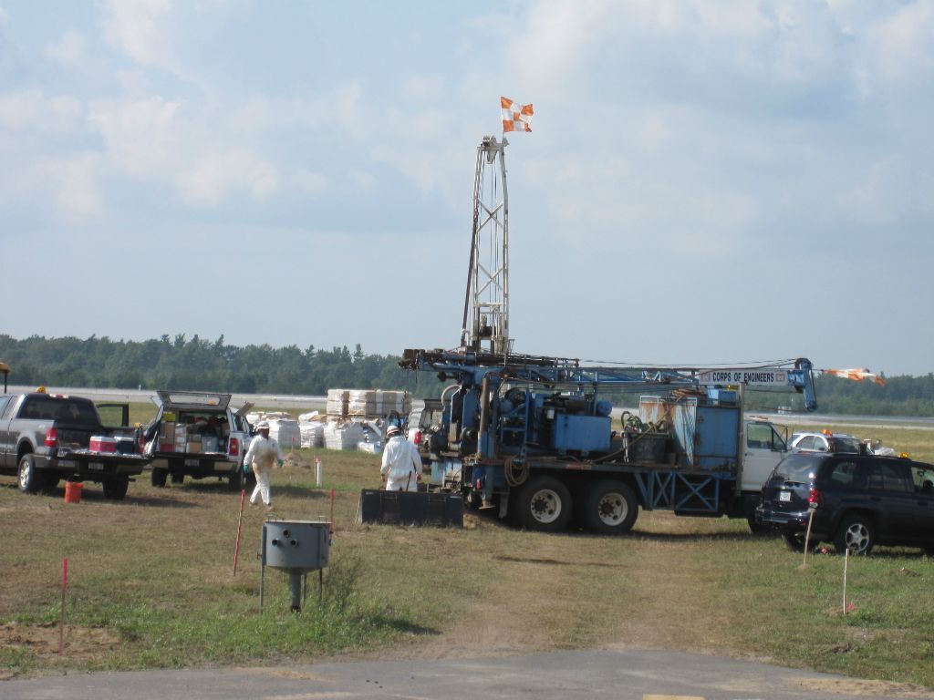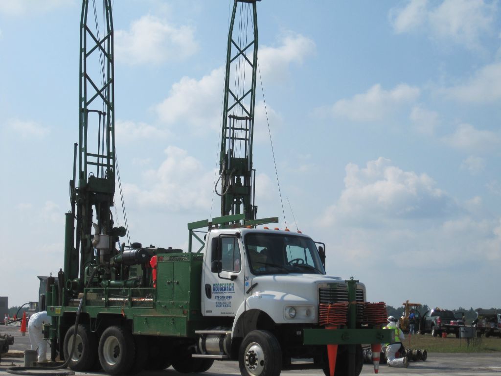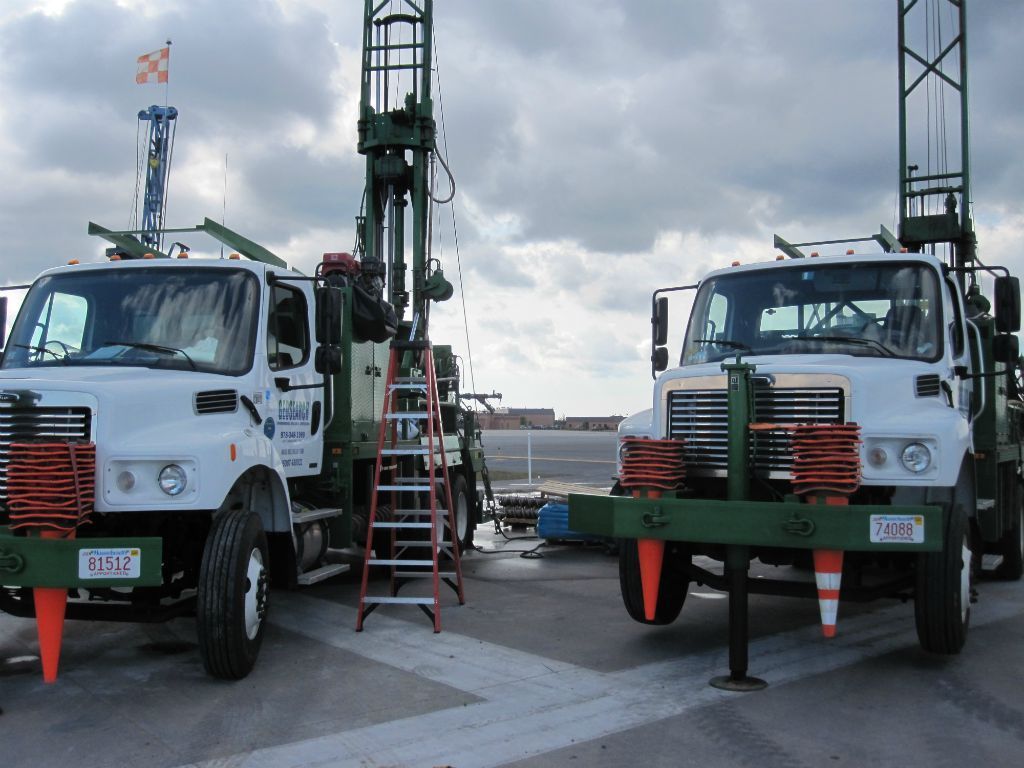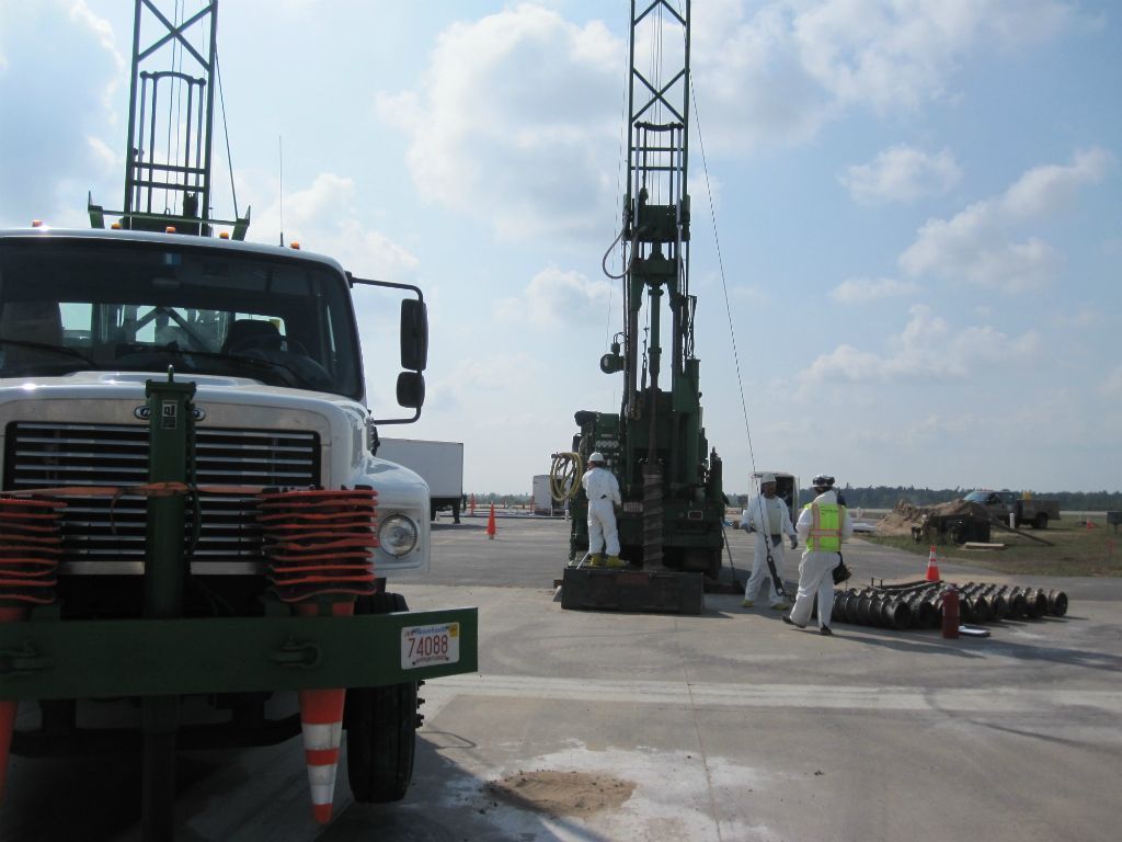 Geosearch completes (96) 6" and (25) 2” wells all to 55’. Due to the large volume of excess soils, it was collected by skid steer and moved to a roll off container on site. Geosearch crews needed to complete a mandatory driver safety training and health and safety training, because of the close proximity of well locations to facility runway.​