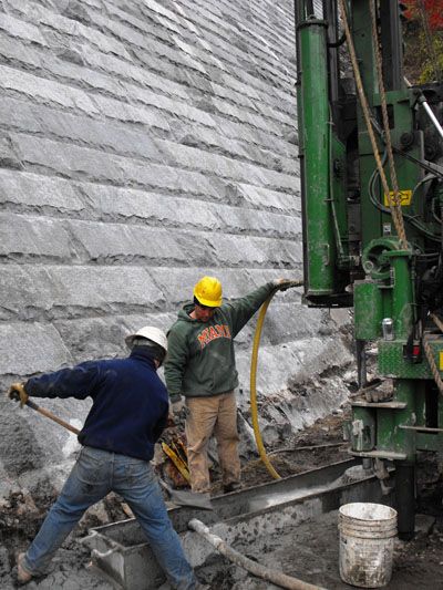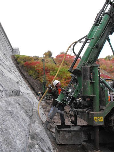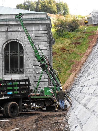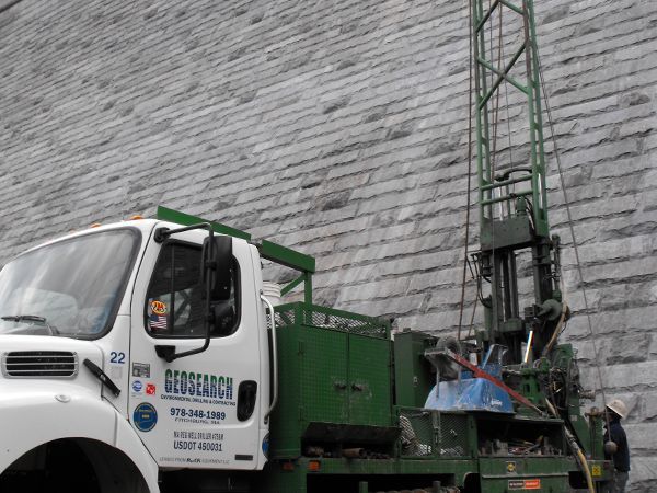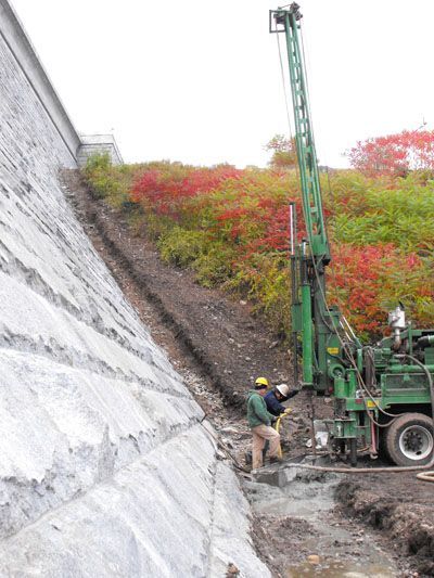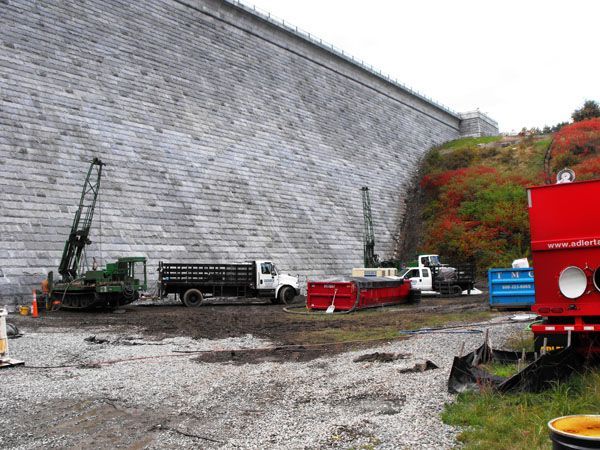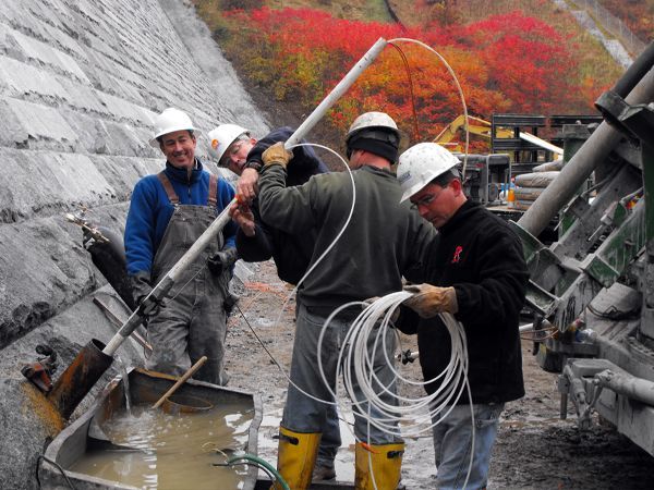 Geosearch advanced multiple piezometers to depths of 100’ to 110’. Drilling was completed by angle drilling, drive and wash casing, air hammer and roller bit. Angel locations required drilling through the base of the dam. In order to keep the site clean all cuttings and water were diverted to a frac tank located onsite.​